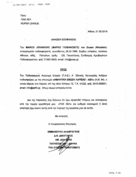 «Η ΠΑΕ ΑΕΛ σε συνέχεια της προχθεσινής ανακοίνωσης της, που αφορούσε τον ποδοσφαιριστή Γιοβάνοβιτς και τον ΠΣΑΠ, δημοσιοποιεί έγγραφο του δικηγόρου του ΠΣΑΠ που μας απέστειλαν.