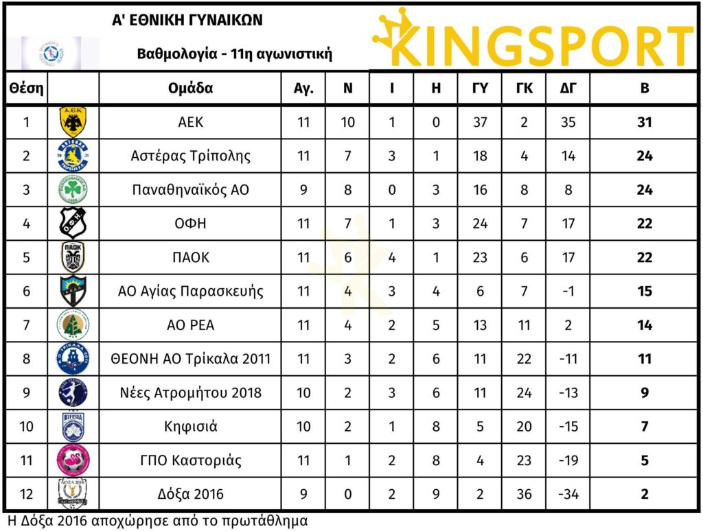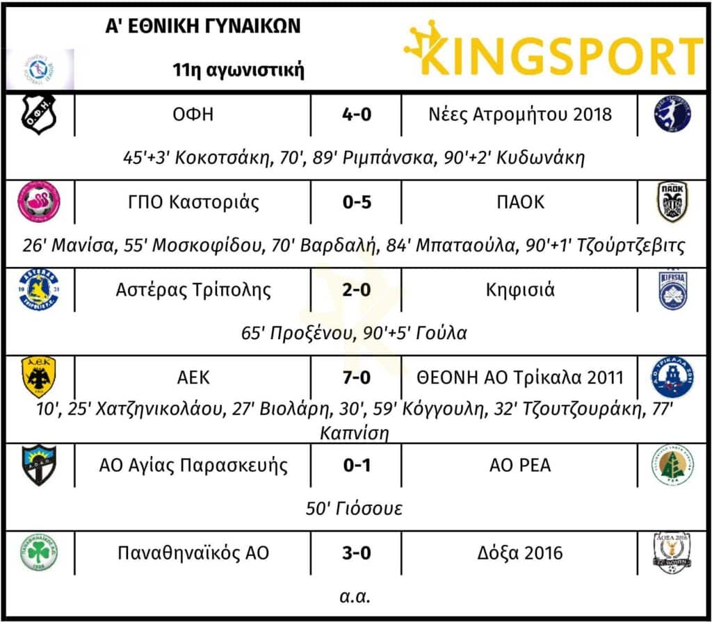 Για την 11η αγωνιστική της Α’ Εθνικής Γυναικών και τελευταία για τον πρώτο γύρο του πρωταθλήματος, η ΑΕΚ επικράτησε με 7-0 των Τρικάλων και συνεχίζει αήττητη στην κορυφή.