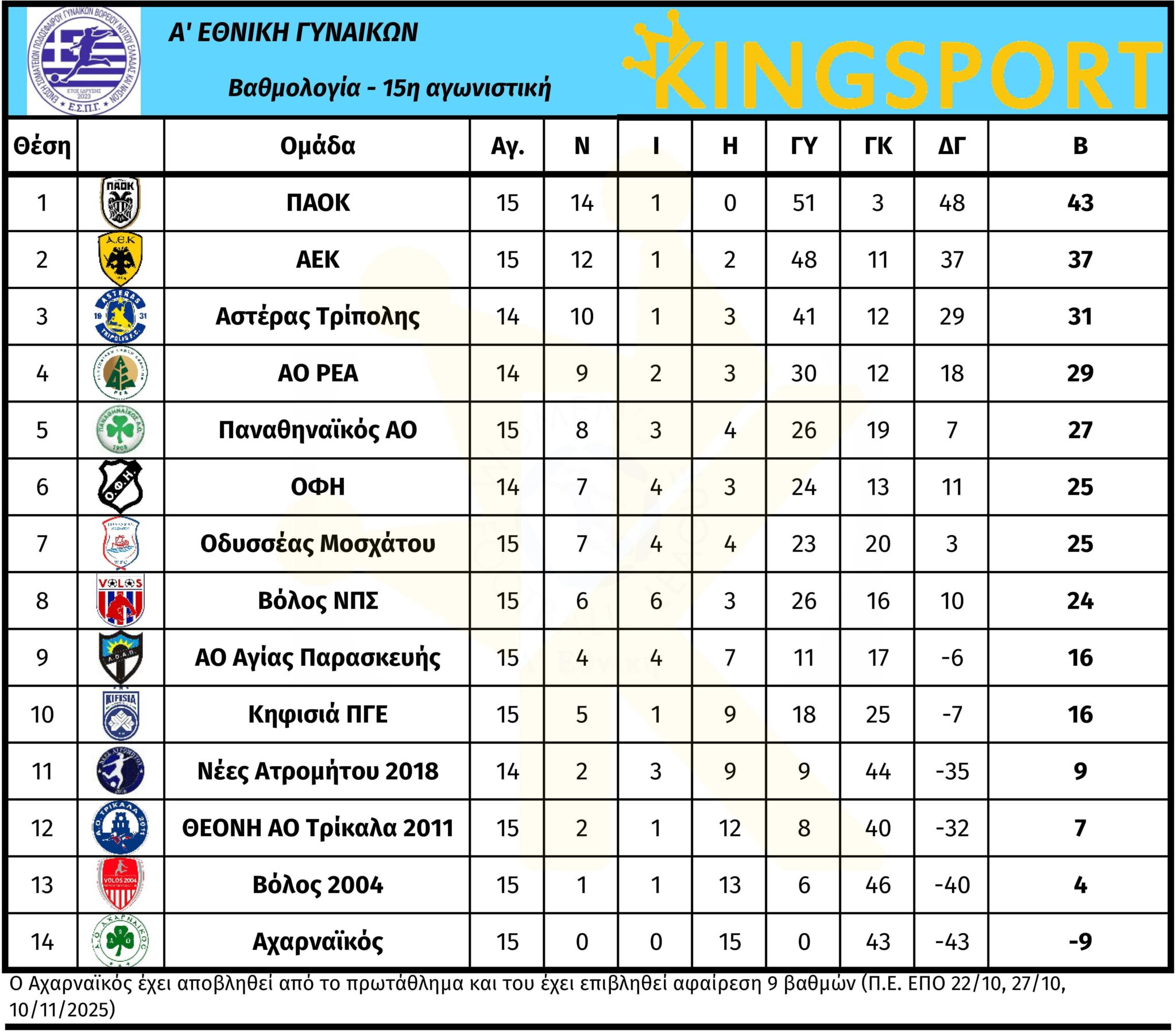 Τέλος, ο Παναθηναϊκός πήρε τη νίκη άνευ αγώνα επί του αποσυρθέντα Αχαρναϊκού.