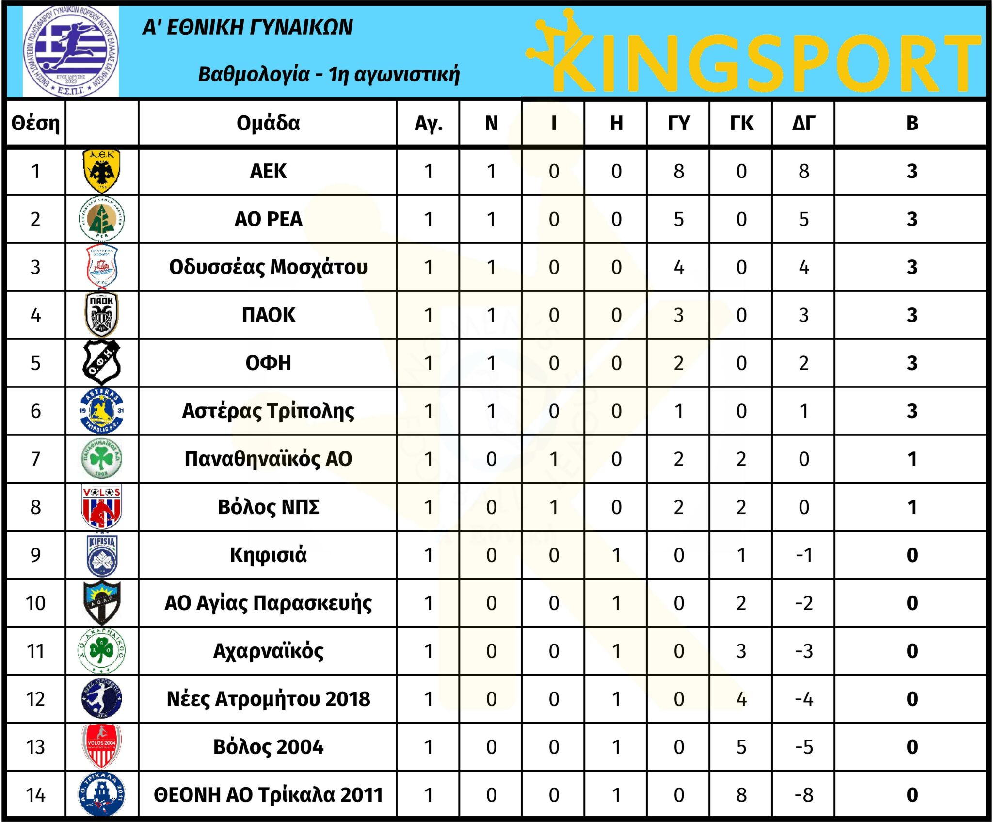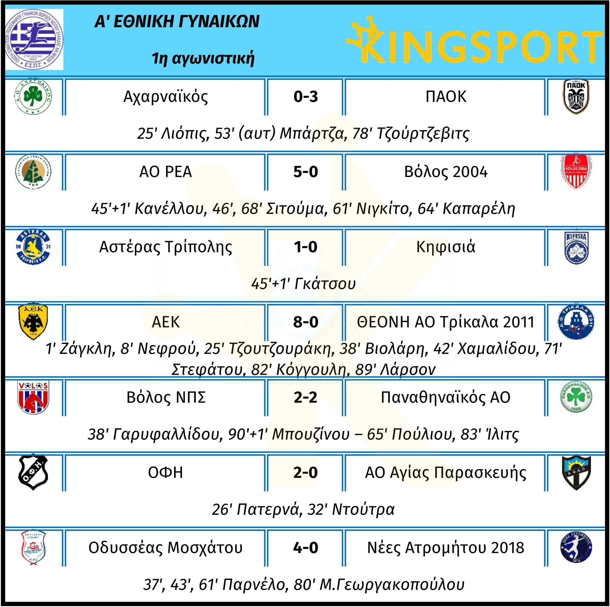 Ενώ στους αγώνες της Κυριακής, η περσινή νταμπλούχος ΑΕΚ νίκησε με 8-0 τα Τρίκαλα.