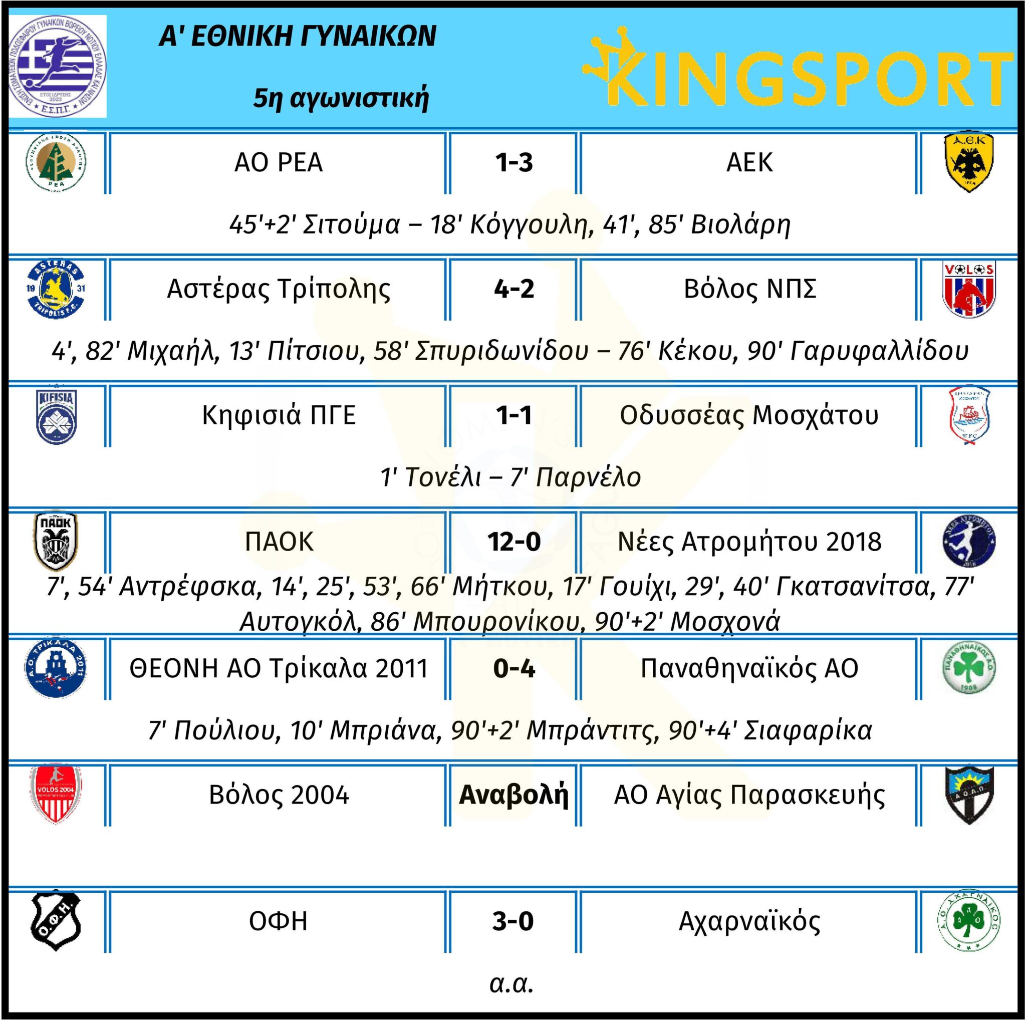 Στον αγώνα του Σαββάτου, η ΑΕΚ πέρασε νικηφόρα με 1-3 από την έδρα της ΡΕΑ και μοιράζεται την πρώτη θέση με τον ΠΑΟΚ στους 15 βαθμούς έχοντας το «5 στα 5». Η Ένωση πήρε τη νίκη με ένα γκολ της Σοφίας Κόγγουλη και δύο της Άντρης Βιολάρη, ενώ η ΡΕΑ μείωσε με την Τόπιστερ Σιτούμα. Η ομάδα του Ρεθύμνου γνωρίζει την ήττα για δεύτερη συνεχόμενη αγωνιστική και μένει στους 9 βαθμούς.