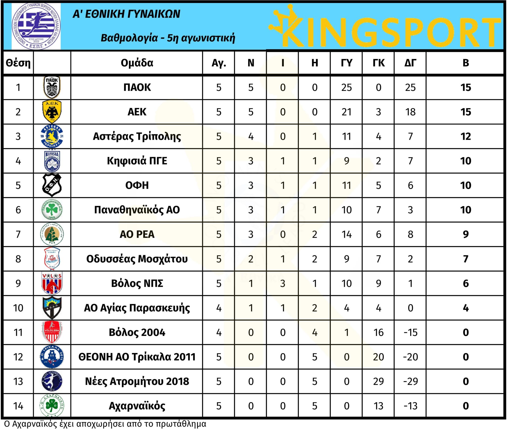 Στους αγώνες της Κυριακής, ο ΠΑΟΚ νίκησε με 12-0 τις Νέες Ατρομήτου, πετυχαίνοντας από 6 γκολ σε κάθε ημίχρονο και «συγκατοικεί» στην κορυφή με την ΑΕΚ (με καλύτερη διαφορά τερμάτων) επίσης με «5 στα 5». Μάλιστα, η ομάδα της Θεσσαλονίκης έχει μηδέν παθητικό ως τώρα.