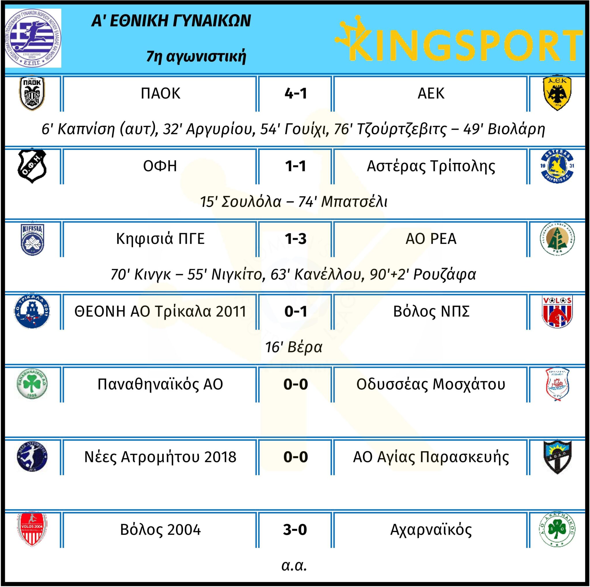 Στο ντέρμπι κορυφής της αγωνιστικής, ο ΠΑΟΚ νίκησε με 4-1 την ΑΕΚ και με 21 βαθμούς βρίσκεται μόνος πρώτος. Οι «ασπρόμαυρες» άνοιξαν το σκορ στο 5’ με αυτογκόλ της Καπνίση, για να κάνει το 2-0 η Αργυρίου στο 32’. Στο δεύτερο μέρος, οι «κιτρινόμαυρες» μείωσαν στο 49’ με τη Βιολάρη, με την ομάδα της Θεσσαλονίκης να διαμορφώνει το τελικό σκορ αρχικά στο 56’ με τη Γουίχι και ακολούθως στο 76’ με τη Τζούρτζεβιτς. Από την πλευρά της, η ΑΕΚ είχε την πρώτη της φετινή ήττα (και απώλεια βαθμών γενικά) στο πρωτάθλημα, ενώ το τέρμα που πέτυχε ήταν ταυτόχρονα και το πρώτο που δέχθηκε ο ΠΑΟΚ.