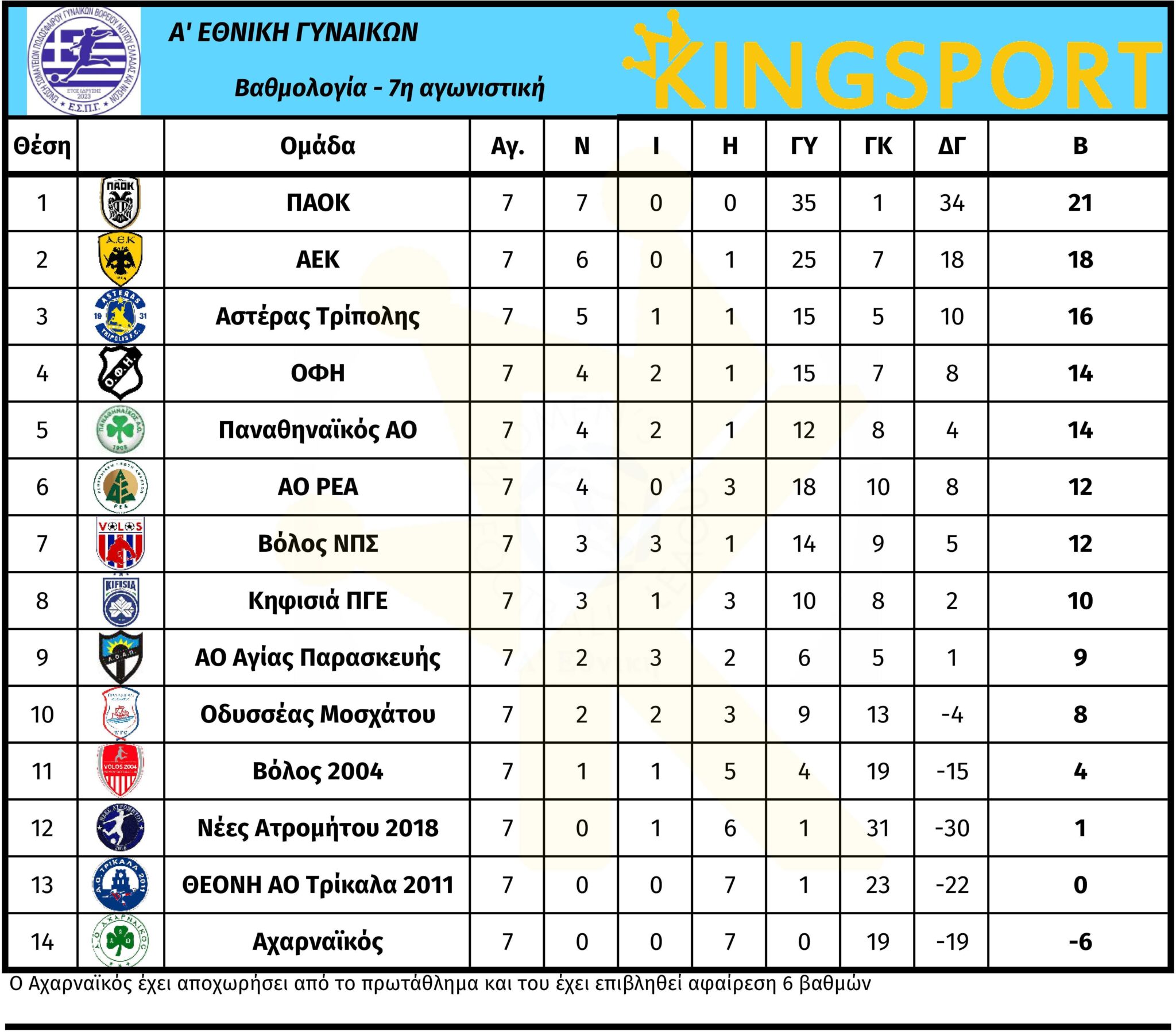 Τα αποτελέσματα της 7ης αγωνιστικής της Α’ Εθνικής Γυναικών 2025-26 και η βαθμολογία.