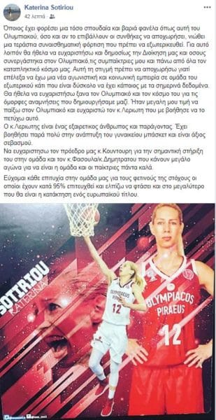 «Ο ΟΛΥΜΠΙΑΚΟΣ ΣΦΠ ανακοινώνει την κοινή συναινέσει λύση της συνεργασίας με την Κατερίνα Σωτηρίου, για καθαρά προσωπικούς λόγους της αθλήτριας».