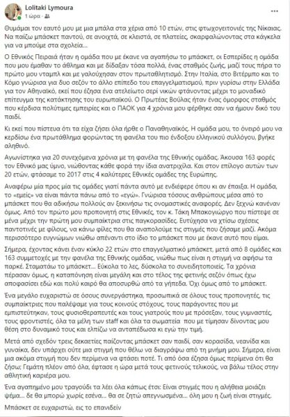 Μετά από σχεδόν τρεις δεκαετίες παίζοντας μπάσκετ σαν παιδί, σαν κορασίδα, νεανίδα και γυναίκα, δεν υπάρχει ούτε μια στιγμή που θέλω να διαγράψω από τη μνήμη μου. Σήμερα, είναι μια ακόμα στιγμή που δεν περίμενα να φτάσει ποτέ. Τι από όσα έζησα όμως περίμενα ότι θα ζήσω; Γεμάτη πλέον από όλα, έφτασε η ώρα μετά τους φετινούς τελικούς, να βάλω τέλος στην αθλητική καριέρα μου.