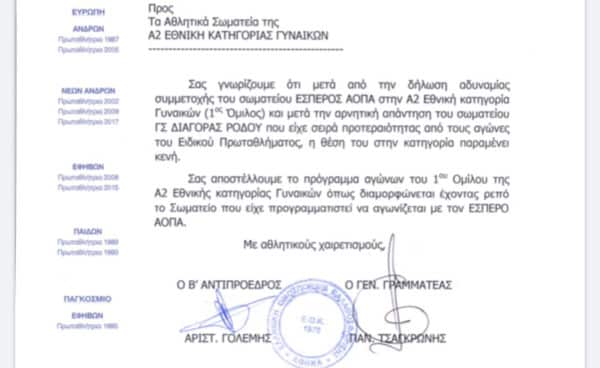 Αλλαγή σκηνικού στην Α2 κατηγορία Νότου Γυναικών. Ύστερα από την απόσυρση του Έσπερου Πατρών να συμμετάσχει στο πρωτάθλημα, ήρθε και η άρνηση του Διαγόρα Ρόδου.