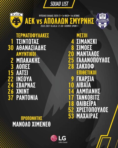 Αναλυτικά η αποστολή της ΑΕΚ: Τσιντώτας, Αθανασιάδης, Μπακάκης, Λόπες, Λάτσι, Ινσούα, Σβάρνας, Χνιντ, Ραντόνια, Σιμάνσκι, Σιμόες, Μάνταλος, Γαλανόπουλος, Σάκχοφ, Μαχαίρας, Γκαρσία, Λιβάια, Αλμπάνης, Τάνκοβιτς, Ολιβέιρα, Χριστόπουλος.