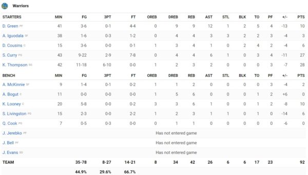 Από την άλλη, ο Τόμπσον αν κι επέστρεψε και σημείωσε 28 πόντους, φαίνεται πως δεν έφτανε με την απουσία του Ντουράντ να είναι και πάλι αισθητή. Ο Στεφ Κάρι από την πλευρά του έμεινε στους 27 πόντους.