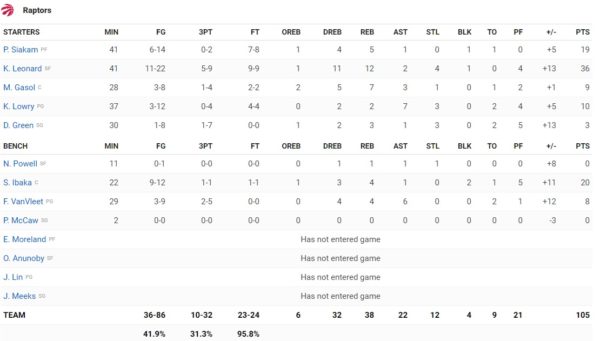 Οι Ράπτορς, πήραν την νίκη και πάλι μέσα στο Γκόλντεν Στέιτ, επικρατώντας 92-105 των Ουόριορς κάνοντας το 3-1 στη σειρά και πλέον απέχουν μία νίκη από το να γράψουν ιστορία και να στεφθούν πρωταθλητές.