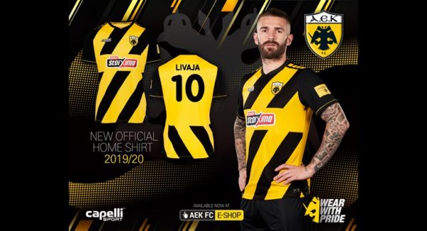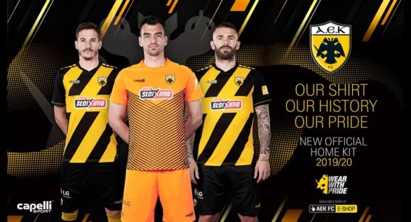 Κιτρινόμαυρη, παραδοσιακή με μοναδική καινοτομία τις πλαγιές ρίγες είναι η πρώτη φανέλα της ΑΕΚ για την νέα σεζόν 2019-20.