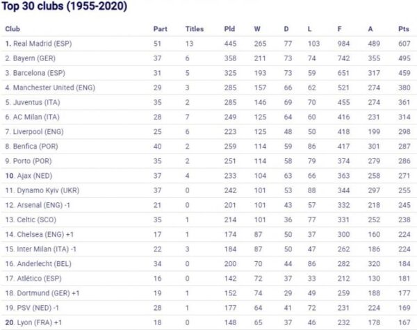 Η UEFA ανακοίνωσε τη λίστα με της 30 καλύτερες ομάδες του Κυπέλλου Πρωταθλητριών και Champions League, από το ξεκίνημα της διοργάνωσης το 1955, έως και το 2020.