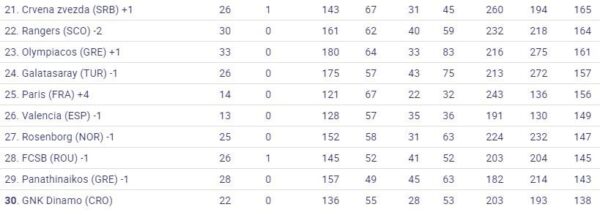 Ο Ολυμπιακός βρίσκεται στην 23η θέση της λίστας, έχοντας αγωνιστεί σε 33 σεζόν, έχοντας δώσει 180 αγώνες, στους οποίους έχει 64 νίκες, 33 ισοπαλίες και 83 ήττες και τέρματα 216 υπέρ και 275 κατά, ενώ συγκεντρώνει 161 βαθμούς.