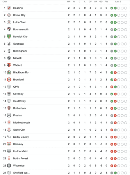 Στην κορυφή της βαθμολογίας βρέθηκαν οι Ρέντινγκ, Μπρίστολ Σίτι και Λούτον που συνέχισαν με νίκες. Στα «σχοινιά» η Νότιγχαμ Φόρεστ του Λαμουσί που άρχισε με δύο ήττες!