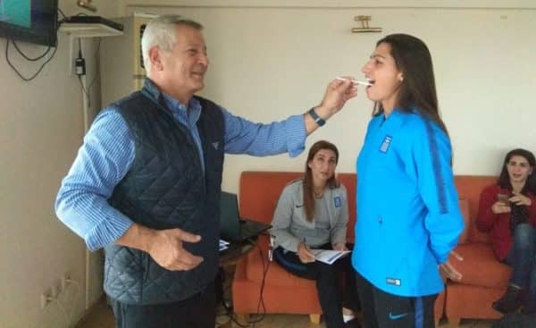 Στη συνέχεια ο κ. Αδαμόπουλος προχώρησε στη διαδικασία λήψης σιέλου από τις παίκτριες της Εθνικής Ομάδας Γυναικών. Τα δείγματα αυτά θα εξεταστούν και θα παραμείνουν στην ειδική ‘δεξαμενή”, έτσι ώστε, αν στο μέλλον προκύψει συμβατότητα με κάποιον ασθενή, ο δότης, εν προκειμένω κάποια από τις αθλήτριες της Εθνικής, να μπορεί να προχωρήσει στην εθελοντική παροχή μυελού των οστών.