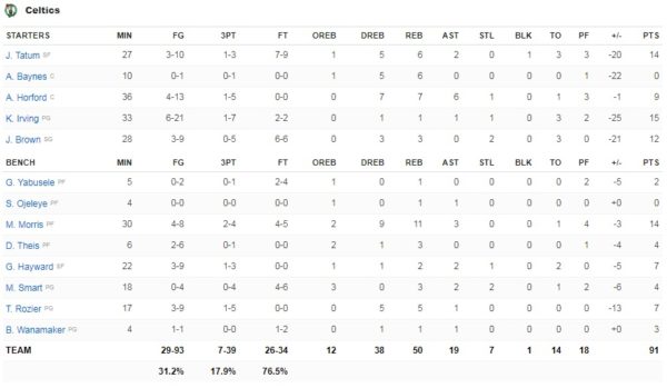 Ο Greek Freak ήταν και πάλι εξαιρετικός. Τελείωσε τον αγώνα με 20 πόντους (4/5 βολές, 8/12 δίποντα, 0/2 τρίποντα), 8 ριμπάουντ, 8 ασίστ, 2 κλεψίματα, 2 τάπες και 4 λάθη σε μόλις 31 λεπτά. Ο Κρις Μίντλετον με 19 και ο Έρικ Μπλέντσο με 18 πόντους τον ακολούθησαν. Αποκαρδιωτική εμφάνιση από τους Σέλτικς με τον Κάιρι Ίρβινγκ πρώτο σκόρερ μεν με 15 πόντους, αλλά μόλις 6/21 σουτ και 1 ασίστ.
