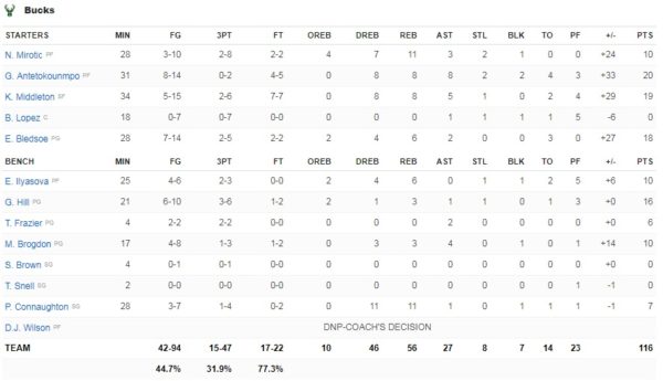 Ο Greek Freak ήταν και πάλι εξαιρετικός. Τελείωσε τον αγώνα με 20 πόντους (4/5 βολές, 8/12 δίποντα, 0/2 τρίποντα), 8 ριμπάουντ, 8 ασίστ, 2 κλεψίματα, 2 τάπες και 4 λάθη σε μόλις 31 λεπτά. Ο Κρις Μίντλετον με 19 και ο Έρικ Μπλέντσο με 18 πόντους τον ακολούθησαν. Αποκαρδιωτική εμφάνιση από τους Σέλτικς με τον Κάιρι Ίρβινγκ πρώτο σκόρερ μεν με 15 πόντους, αλλά μόλις 6/21 σουτ και 1 ασίστ.