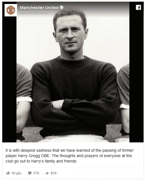 Φτωχότερο έγινε το ποδόσφαιρο καθώς απεβίωσε ο Χάρι Γκρεγκ σε ηλικία 87 ετών, ο εκλιπών υπήρξε τερματοφύλακας της Μάντσεστερ Γιουνάιτεντ και της Βόρειας Ιρλανδίας . Ο Χάρι Γκρεγκ ήταν ένας από τους επιζώντες της αεροπορικής τραγωδίας του Μονάχου το 1958. Σε λιγότερο από τρεις μήνες μετά το ντεμπούτο του στο «Όλντ Τράφορντ», ο Γκρεγκ και οι συμπαίκτες του επέστρεφαν από το Βελιγράδι, όπου είχαν αντιμετωπίσει τον Ερυθρό Αστέρα. Σταμάτησαν για ανεφοδιασμό στο Μόναχο. Ήταν 6 Φεβρουαρίου, όταν το αεροπλάνο τους συνετρίβη. Ανάμεσα σε εκείνους που σκοτώθηκαν ήταν οκτώ παίκτες της Μάντσεστερ Γιουνάιτεντ.
