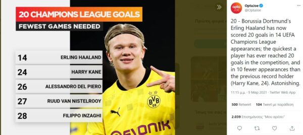 Ο Kylian Mbappe πέτυχε που είχε σημειώσει χατ τρικ στο ματς της Βαρκελώνης, σκόραρε και στο πρόσφατο 1-1 του Παρισιού για να γίνει ο νεαρότερος ποδοσφαιριστής (22 χρ. και 80 ημερών) που φτάνει τα 25 γκολ στη διοργάνωση ξεπερνώντας τον Messi (22 και 280 ημ.). Εννοείται πως έτσι όπως το πάει ο Erling Haaland δεν θα αργήσει να τον ξεπεράσει. Ο 20χρονος Νορβηγός στράικερ της Dortmund προχτές με τα δύο τέρματα του κόντρα στη Sevilla έφτασε τα 20 Champions League γκολ για τα οποία χρειάστηκε μόλις 14 (!) ματς ‘‘διαλύοντας‘‘ το ρεκόρ του Harry Kane που για τον ίδιο αριθμό τερμάτων είχε χρειαστεί 24 αγώνες!