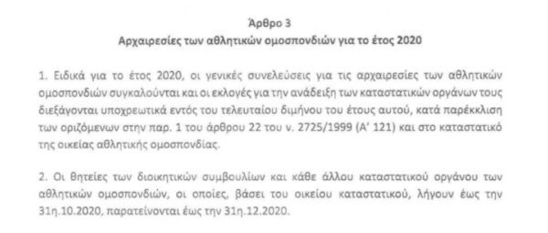 Όπως αναφέρει η τροπολογία, ο αθλητικός νόμος, με τον οποίο θα ορίζεται το καθεστώς των εκλογών, θα κατατεθεί τέλη Αυγούστύ ή αρχές Σεπτεμβρίου, ενώ η διαδικασία θα πραγματοποιηθεί το τελευταίο δίμηνο του 2020.