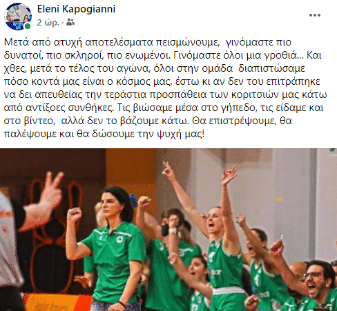 Η Ελένη Καπογιάννη με ανάρτηση της αναφέρθηκε στην ήττα του Παναθηναϊκού από τον Ολυμπιακό και στις αντίξοες συνθήκες που αντιμετώπισε η ομάδα της στο Φάληρο.