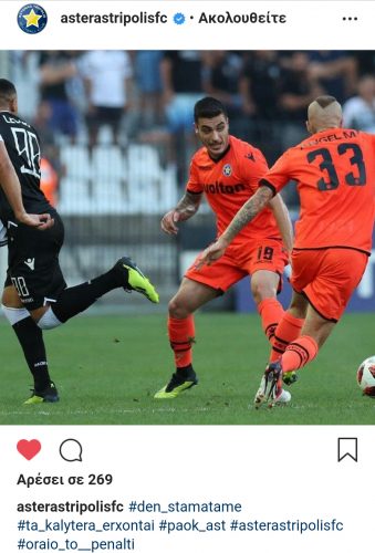 Ύστερα η διοίκηση του Αστέρα τοποθετήθηκε έμμεσα με μια δημοσίευση της στο Instagram αναφέροντας σε hashtag την φράση “ωραίο το πέναλτι”