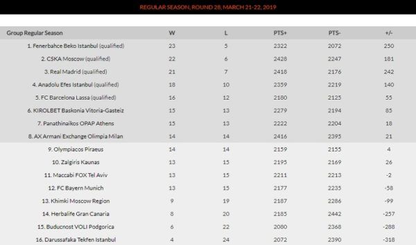 Από την άλλη, ο Ολυμπιακός μετά τη συντριβή από την Γκραν Κανάρια έπεσε στο 14-14 και έτσι μετά την ολοκλήρωση της 28ης αγωνιστικής βρίσκεται στην ένατη θέση και φυσικά εκτός playoffs.