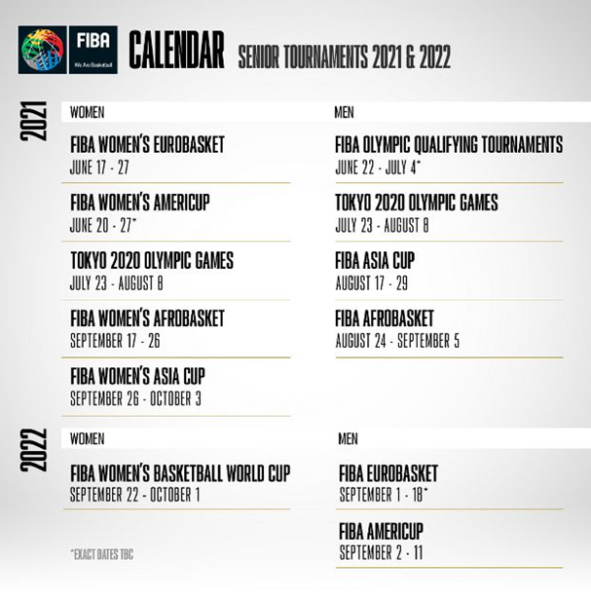 Έτσι, τα Προολυμπιακά τουρνουά για την πρόκριση στο Ολυμπιακό τουρνουά του Τόκιο θα διεξαχθούν από τις 22 Ιουνίου έως τις 4 Ιουλίου 2021, με τους Ολυμπιακούς Αγώνες να γίνονται από 23 Ιουλίου έως 8 Αυγούστου. Το EuroBasket ανδρών που είχε οριστεί για το επόμενο καλοκαίρι θα διεξαχθεί από την 1η έως τις 18 Σεπτεμβρίου του 2022, ενώ το EuroBasket γυναικών θα λάβει χώρα από 22 Σεπτεμβρίου μέχρι 1 Οκτωβρίου 2022..