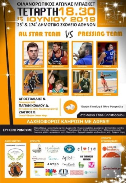 Εντός γηπέδου, πρώην και νυν διεθνείς αθλητές όπως οι Άρτεμις Σπανού, Αφέντρα Παπαδήμου, Κατερίνα Χαλικιά, Αφεντούλα Μαγαλιού, Άγγελο Τσίκληρα, με προπονητές τον Αχιλλέα Δεμέναγα & τον Παναγιώτη Γκρίτζαλη καθώς και εκπρόσωποι όλων των κατηγοριών του ελληνικού μπάσκετ, τίθενται αντιμέτωποι με την “Pressing team”, ομάδα δημοσιογράφων & ανθρώπων από τον ευρύτερο χώρο που με όχημα τον αθλητισμό συνδράμουν σε ομάδες ανθρώπων οι οποίοι έχουν ανάγκη από υποστήριξη για καλό σκοπό!Ο αγώνας διοργανώνεται την Τετάρτη 5 Ιουνίου στις 18:30, στο ανοιχτό γήπεδο των σχολείων (Τράλλεων & Πανδοσίας 2).