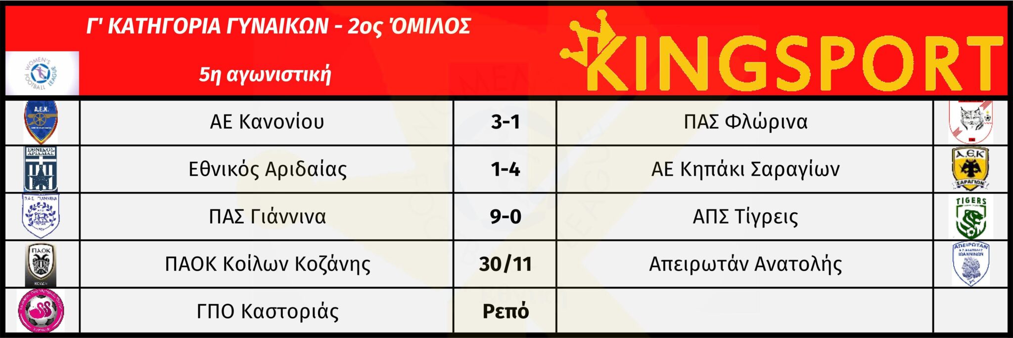 Για το Περιφερειακό Πρωτάθλημα Γ’ Κατηγορίας Γυναικών, του Σαββατοκύριακου 22-23/11 διεξήχθησαν οι αγώνες της 5ης αγωνιστικής των ομίλων 1, 2, 3, 5 και της 4ης αγωνιστικής των ομίλων 4, 6, 7.