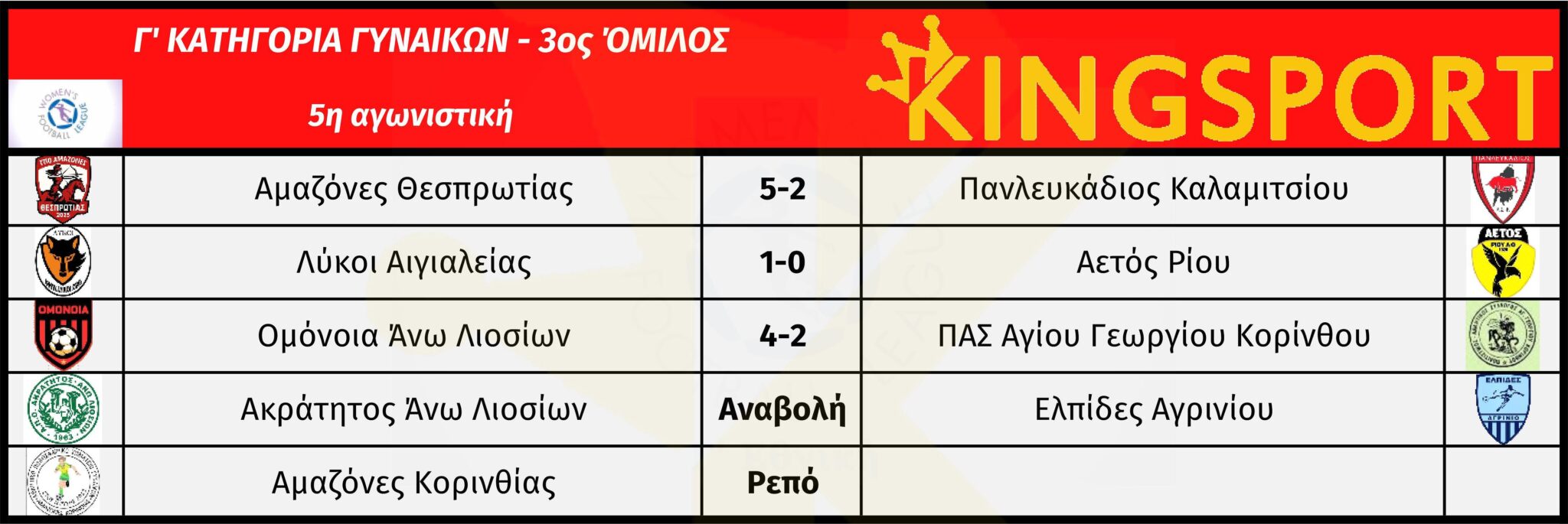 3ος όμιλος: ΠΑΣ Αγίου Γεωργίου Κορίνθου – Ακράτητος Άνω Λιοσίων (1η αγωνιστική), Ακράτητος Άνω Λιοσίων – Ομόνοια Άνω Λιοσίων (2η αγωνιστική), Ακράτητος Άνω Λιοσίων – Αμαζόνες Θεσπρωτίας (3η αγωνιστική), Αμαζόνες Κορινθίας – Ακράτητος Άνω Λιοσίων (4η αγωνιστική), Ακράτητος Άνω Λιοσίων – Ελπίδες Αγρινίου (5η αγωνιστική)