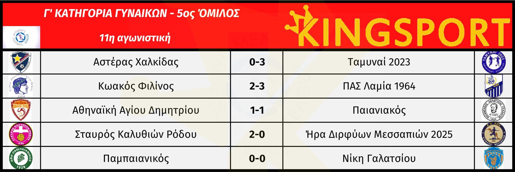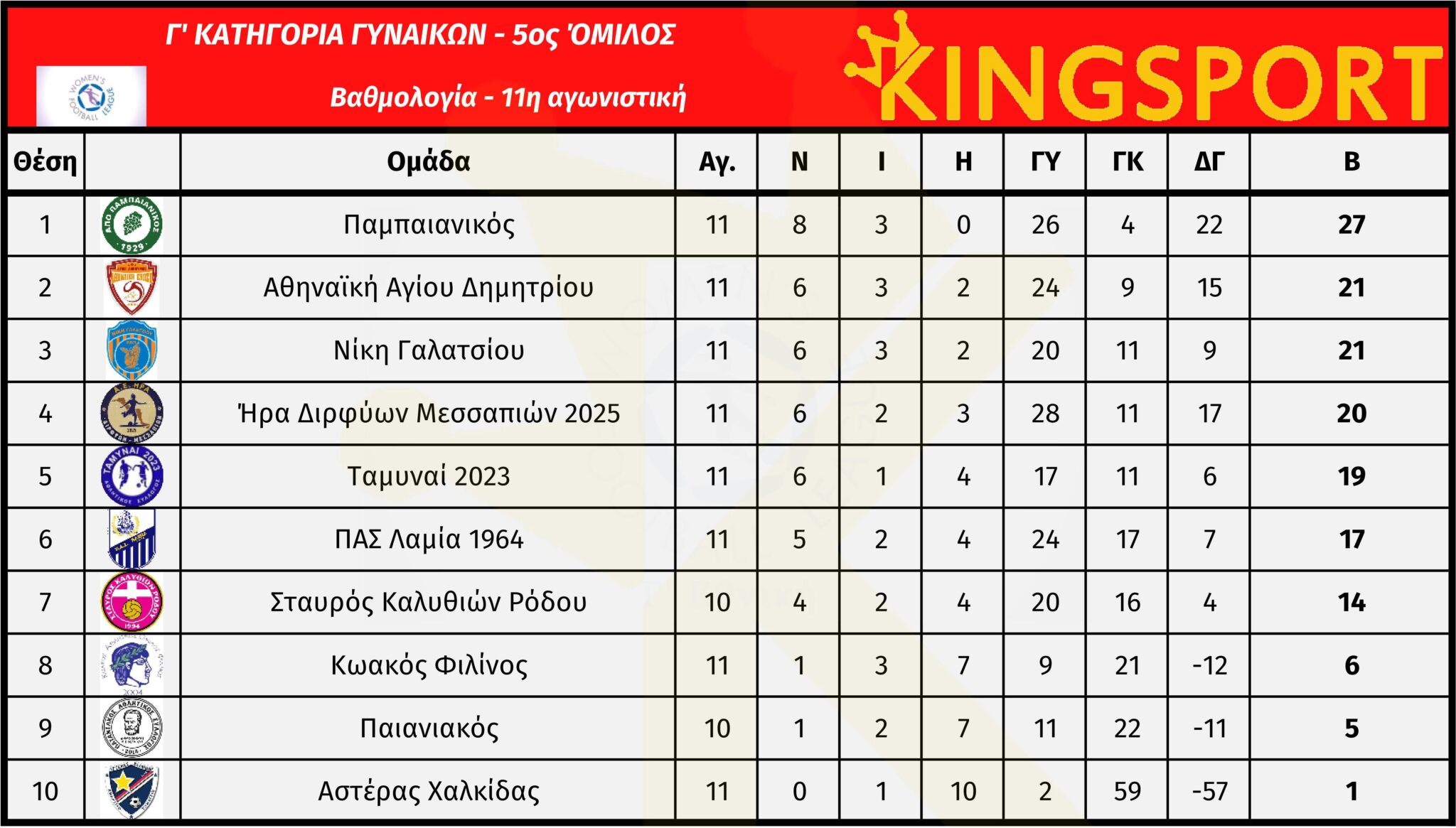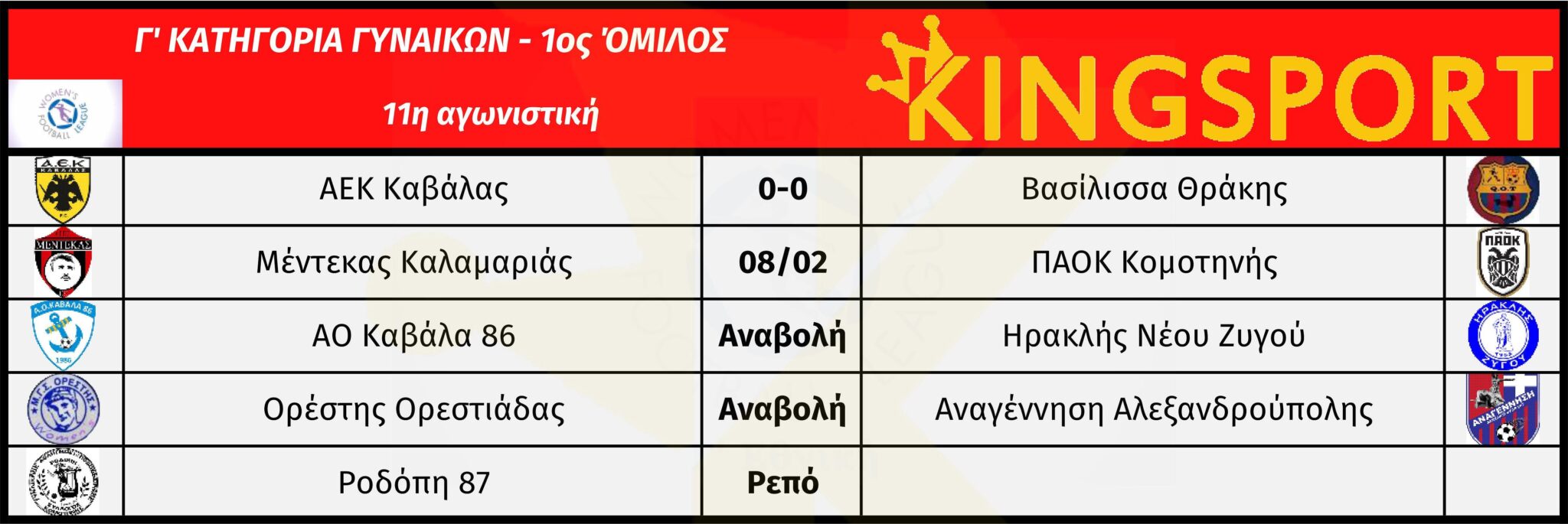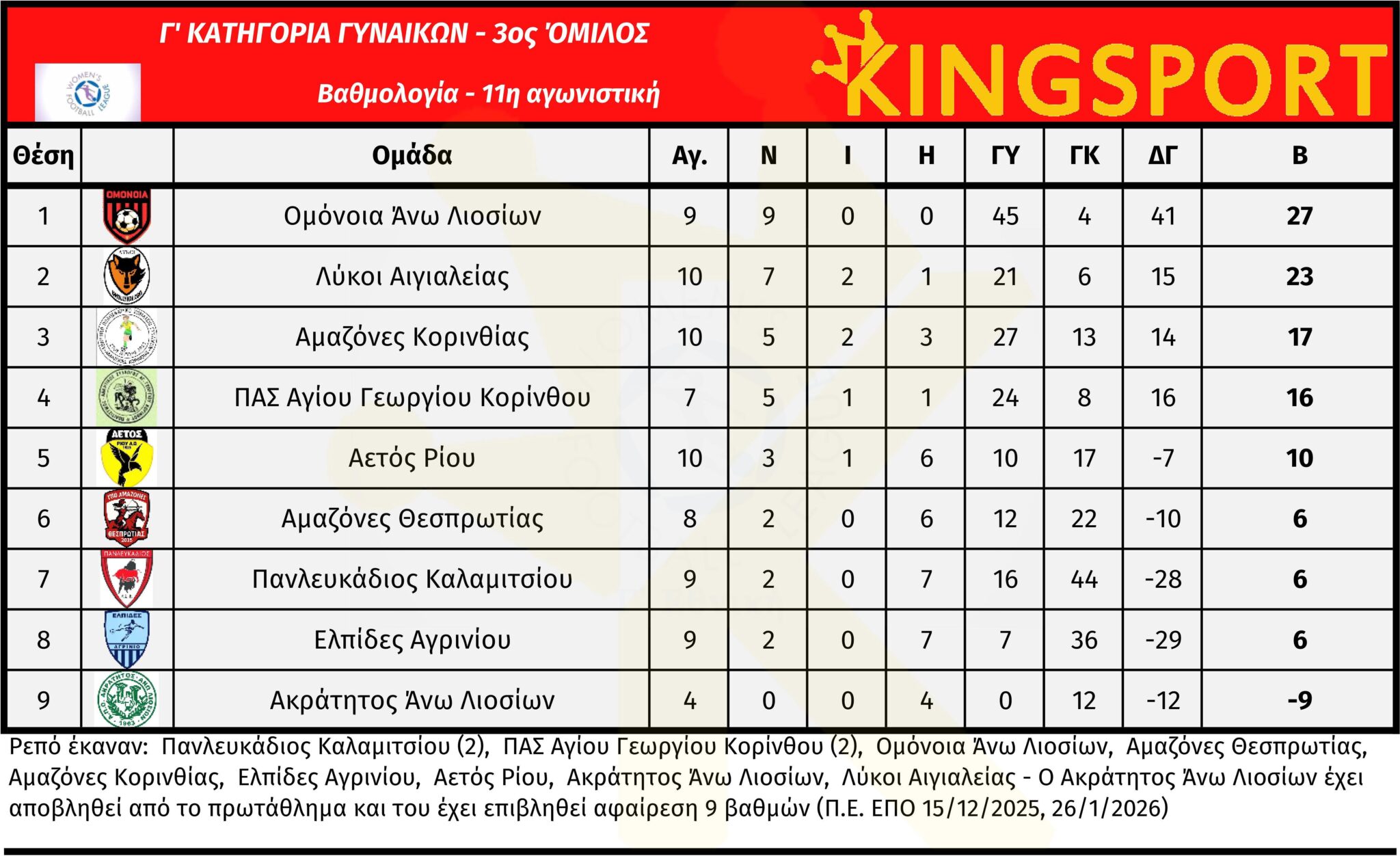 Οι αγώνες του Σαββατοκύριακου 31/1-1/2 στο Περιφερειακό Πρωτάθλημα Γ’ Κατηγορίας Γυναικών 2025-26 και οι βαθμολογίες.