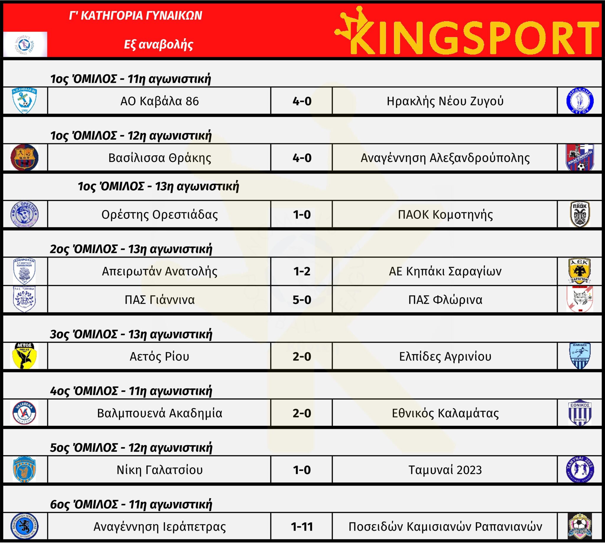 Για το Περιφερειακό Πρωτάθλημα Γ’ Κατηγορίας Γυναικών, διεξήχθησαν εξ αναβολής αγώνες: Για την 11η, 12η  και 13η αγωνιστική του 1ου ομίλου, τη 13η αγωνιστική του 2ου ομίλου, τη 13η αγωνιστική του 3ου ομίλου, την 11η αγωνιστική του 4ου ομίλου, τη 12η αγωνιστική του 5ου ομίλου και την 11η αγωνιστική του 6ου ομίλου.