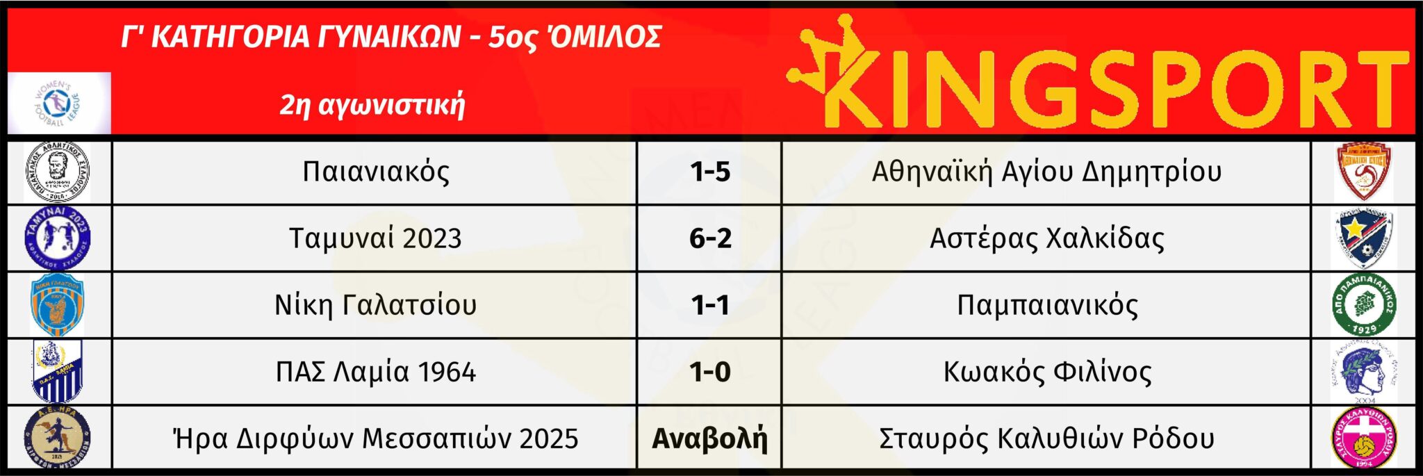 5ος όμιλος: Σταυρός Καλυθιών Ρόδου – Παιανιακός (1η αγωνιστική), Κωακός Φιλίνος – Ταμυναί 2023 (1η αγωνιστική-26/10/2025), Ήρα Διρφύων Μεσσαπιών 2025-Σταυρός Καλυθιών Ρόδου (2η αγωνιστική)