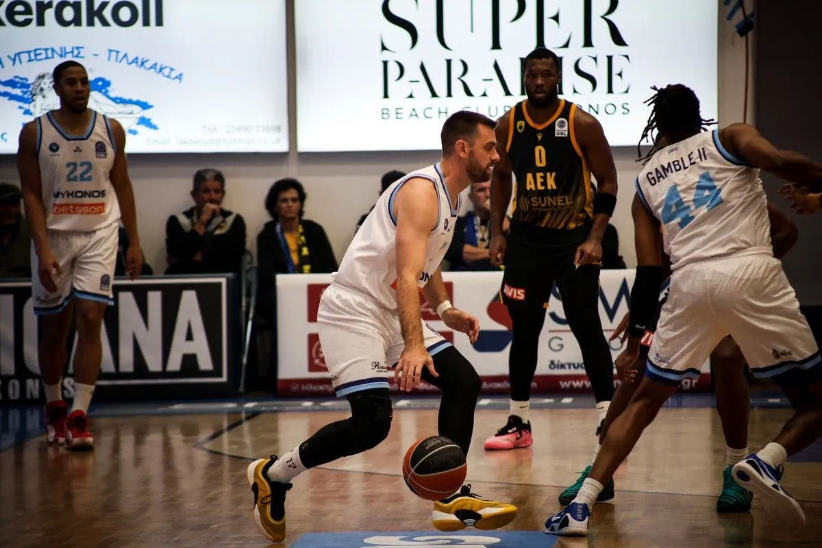Στο κλειστό της Μυκόνου η ΑΕΚ απέδρασε με την νίκη επικρατώντας με 77-76 της γηπεδούχου. Μοιραίος παίκτης για την ομάδα της Μυκόνου ήταν ο Βαγγέλης Μάντζαρης ο οποίος αστόχησε στο σουτ της νίκης.