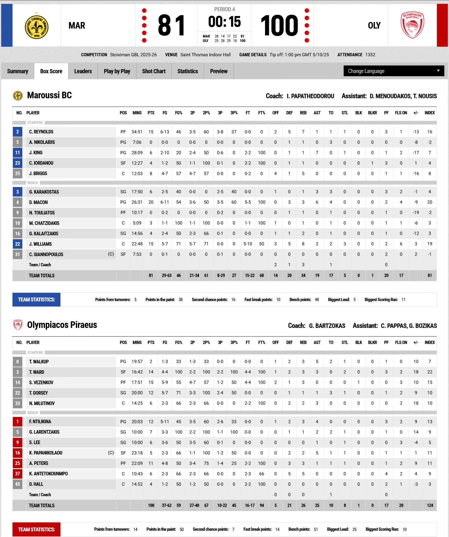Δεκάλεπτα: 28-25, 42-53, 59-82, 81-100