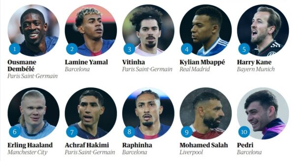 Δεύτερος κατετάγη ο σταρ της Barcelona, Lamine Yamal και τρίτος ο συμπαίκτης του Dembele στην PSG, Πορτογάλος χαφ Vitinha. Να σημειώσουμε εδώ ότι ακριβώς ίδια ήταν η σειρά και στην κορυφαία τριάδα της “Χρυσής μπάλας” ενώ στο αντίστοιχο βραβείο “The Best FIFA Men’s Player” το…”βάθρο” ήταν Dembele, Yamal, Mbappe! Πίσω όμως στη φετινή ψηφοφορία της “Guardian” όπου μετά τους Dembele, Yamal, Vitinha, την πρώτη δεκάδα συμπληρώνουν οι Mbappe, Kane, Haaland, Hakimi, Raphinha, Salah και Pedri.