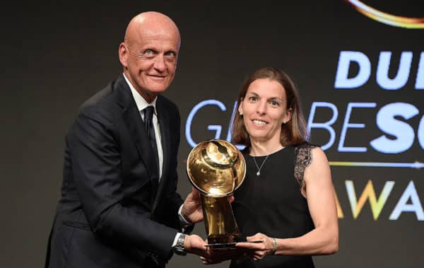 ??? STÉPHANIE FRAPPART presented with BEST REFEREE OF THE YEAR Award by Italian legend Pierluigi Collina #StephanieFrappart #globesoccer @DubaiSC pic.twitter.com/uql6hLj7HK