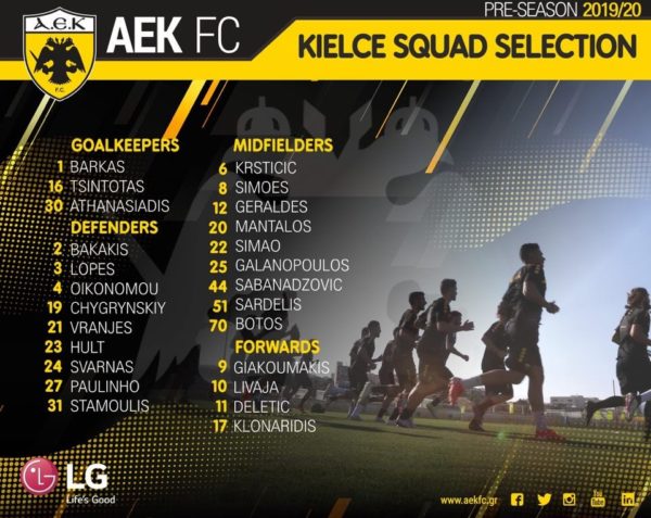 Ο Μιγκέλ Καρντόσο ανακοίνωσε το βράδυ της Δευτέρας (01/07) τους 25 ποδοσφαιριστές που θα ταξιδέψουν στο Κίελτσε, από τους οποίους θα λείπει ο τραυματίας Χρήστος Αλπμάνης και ο κομμένος Ούρος Τσοσιτς.