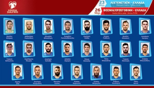Γνωστή έγινε η αποστολή της Εθνικής Ελλάδας για τα δύο ματς με το Λιχτενστάιν (23/3) και την Βοσνία (26/3) για τα προκριμματικά του Ευρωπαϊκού Πρωταθλήματος του 2020.