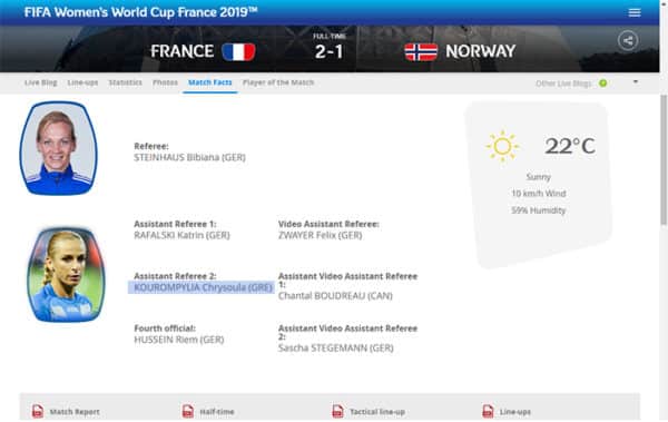 Η Χρυσούλα Κουρομπύλια βρίσκεται στο Παγκόσμιο Κύπελλο Γυναικών που διεξάγεται αυτές τις ημέρες στη Γαλλία. Η παρουσία της είναι φυσικά μεγάλη τιμή και δικαίωση για την Ελληνίδα διαιτητή.