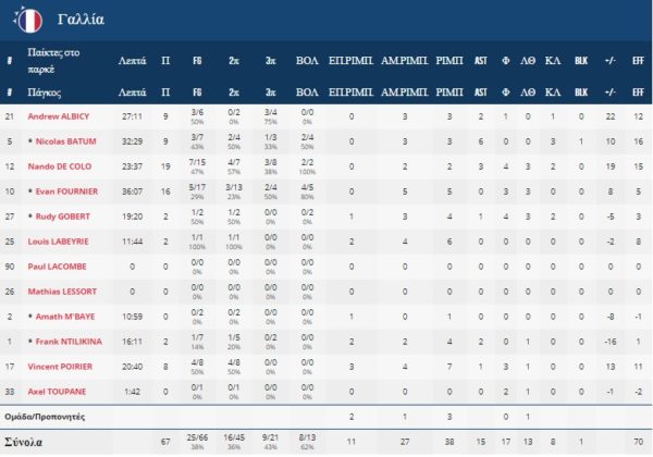 Κορυφαίος για τους Γάλλους ήταν ο νέος αστέρας της Νάντο Ντε Κολό, καθώς πέτυχε 19 πόντους, 2 ριμπάουντ, 3 ασίστ, 2 κλεψίματα και αναδείχθηκε μάλιστα MVP του μικρού τελικού. Μαζί του ήταν ο Φουρνιέ με 16 πόντους και 5 ριμπάουντ και εκεί που έπρεπε έδωσε λύσεις και ο Αλμπισί με τα τρίποντά του 3/4 με 9 πόντους στο σύνολο.