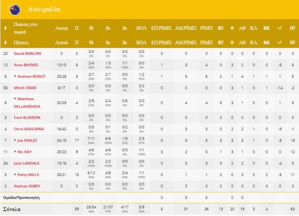 Από την πλευρά των «καγκουρό» εκείνος που ξεχώρισε ήταν ο Τζόε Ινγκλς με 17 πόντους, 5 ριμπάουντ, 3 ασίστ και 1 κλέψιμο. Εκείνος που προσπάθησε να βοηθήσει την Αυστραλία να φτάσει στο τρίτο σκαλί του βάθρου ήταν ο Πάτι Μιλς με 15 πόντους, 1 ριμπάουντ και 2 ασίστ.