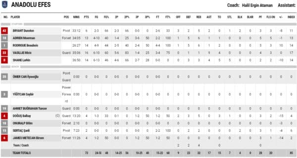 Πολύ καλός ήταν και ο Μέλι με 19 πόντους,Για την Εφές οι Μίσιτς (16π.), Λάρκιν (14π.) και Μπομπουά (14π.) πρόσφεραν στο σκοράρισμα.