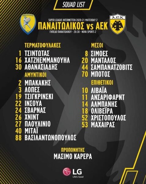 Ο Μάσιμο Καρέρα ενσωμάτωσε τα τρία νέα αποκτήματα στη αποστολή με τους Ινσούα, Χνιντ και Ανσαριφάρντ να είναι στις επιλογές. Οι τραυματίες Γαλανόπουλος, Σιμάνσκι και Κρίστιτιτς έμειναν εκτός, ενώ απουσιάζει και το όνομα του Βέρντε, ο οποίος δεν αντιμετωπίζει κάποιο πρόβλημα.