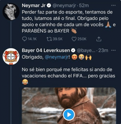 Ωστόσο, αντ’ αυτού, πραγματοποίησε μια γκάφα, στην οποία η “εργοστασιακή ομάδα” απάντησε, λέγοντας: «Σε ευχαριστούμε Νεϊμάρ. Δεν ξέρουμε γιατί μας δίνεις συγχαρητήρια, ενώ είμαστε σε διακοπές και παίζουμε FIFA, αλλά και πάλι σε ευχαριστούμε»