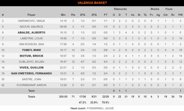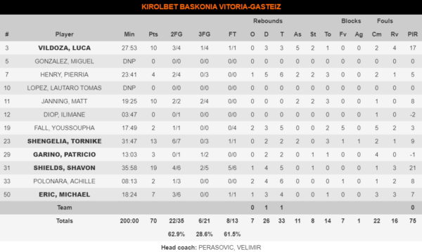 Μπαρτσελόνα (Πέσιτς): Ντέιβις 10 (5 ριμπάουντ, 4 ασίστ), Χάνγκα 5 (1/4 τρίποντα, 6 ριμπάουντ, 3 ασίστ), Οριόλα 8 (2), Αμπρίνες, Χίγκινς 3 (0/7 δίποντα, 1/2 τρίποντα), Ντιλέινι 11 (2/6 τρίποντα, 7 ασίστ), Κούριτς (0/4 σουτ), Κλαβέρ 7 (1), Μίροτις 24 (5/8 δίποντα, 4/8 τρίποντα, 2/2 βολές), Τόμιτς 6 (5 ριμπάουντ, 3 κλεψίματα).