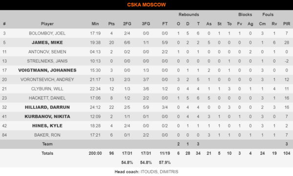Μάικ Τζέιμς και Ντάρουν Χίλιαρντ βρέθηκαν σε μεγάλη βραδιά και καθοδήγησαν μαεστρικά την «ομάδα του στρατού» έχοντας 20 πόντους (με 7/7 εντός παιδιάς), 5 ασίστ και 22 πόντους και 4 ριμπάουντ αντίστοιχα. Με 17/31 τρίποντα ολοκλήρωσε το παιχνίδι το σύνολο του Ιτούδη.