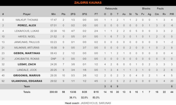 Πρωταγωνιστές για τους Βάσκους οι Σιλντς (19 πόντοι, 5 ριμπάουντ), Βιλντόσα (10 πόντοι, 5 ασίστ) και Σενγκέλια (13 πόντοι), ενώ από τους Λιθουανούς διασώθηκε ο Γκριγκόνις (10 πόντοι), με τους πρώην παίκτες των «αιωνίων», Λεκαβίτσιους και Λεντέι να προσθέτουν 10 και 8 πόντους αντίστοιχα.