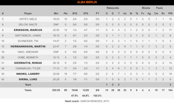 Κορυφαίοι για την ομάδα του Ρενέσες οι Νοκό (16 πόντοι με 7/7 δίποντα, 7 ριμπάουντ), Έρικσον (15 πόντοι, 4 ριμπάουντ), Κάβανο (11 πόντοι), Γκίφι (10 πόντοι), με τους Βερολινέζους να έχουν 12/26 τρίποντα!